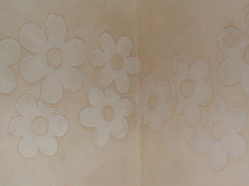 Enduits et stucs à la chaux colorés; enduits à base de chaux, sables et poudres de marbres, enduits à base de terre. Colorés avec des pigments, les nuances de la matière donnent une profondeur à l’enduit. Ces enduits sont une base de travail artistique en tant que support pour des compositions gravées ou peintes, et par la création d’ambiances, structuration de l’espace, jeu avec la lumière.